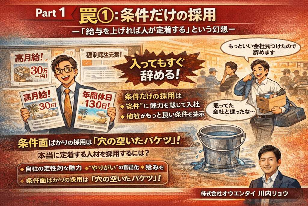 【Part 1】罠①:条件だけの採用〜「給与を上げれば人が定着する」という幻想〜 【Part 1】罠①:条件だけの採用〜「給与を上げれば人が定着する」という幻想〜 経営者の…