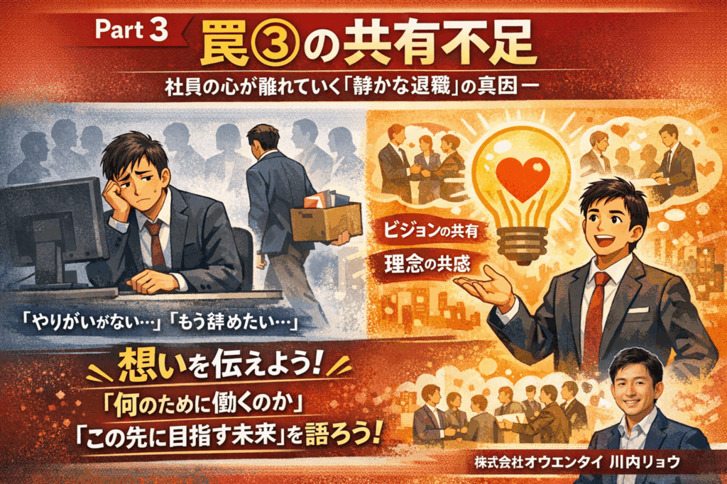 【Part 3】罠③:理念の共有不足〜社員の心が離れていく「静かな退職」の真因〜 経営者の皆様、株式会社オウエンタイの川内リョウです。 これまで、人がすぐに辞める中小… -